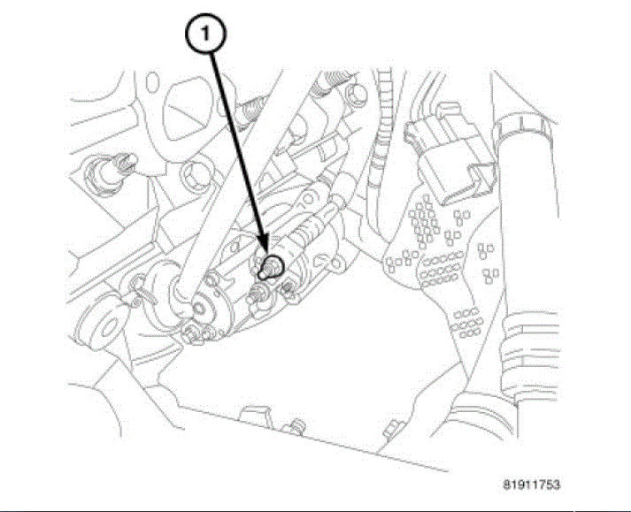 4. Lower starter motor far enough to access and remove nut (1) securing battery cable to starter solenoid B(+) terminal stud. Always support starter motor during this process. Do not let starter motor hang from wire harness.