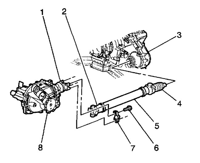 3. Remove the clamp (4) at the transfer case (3) by prying up the exposed end of the clamp (4) with a flat bladed tool.