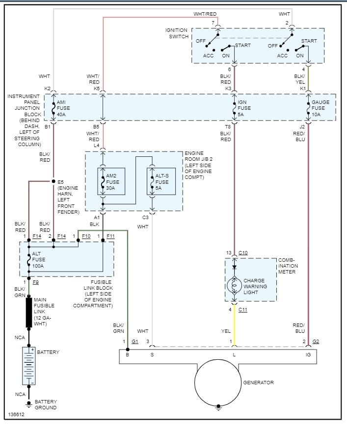 Please note there is still another fusible link between the alternator fuse and the battery. Check out the diagrams (below). This fusible link may also need to be checked if you still have no power at the alternator fuse.
