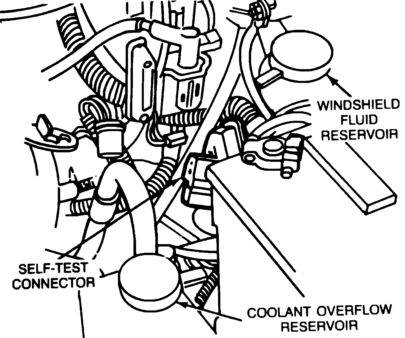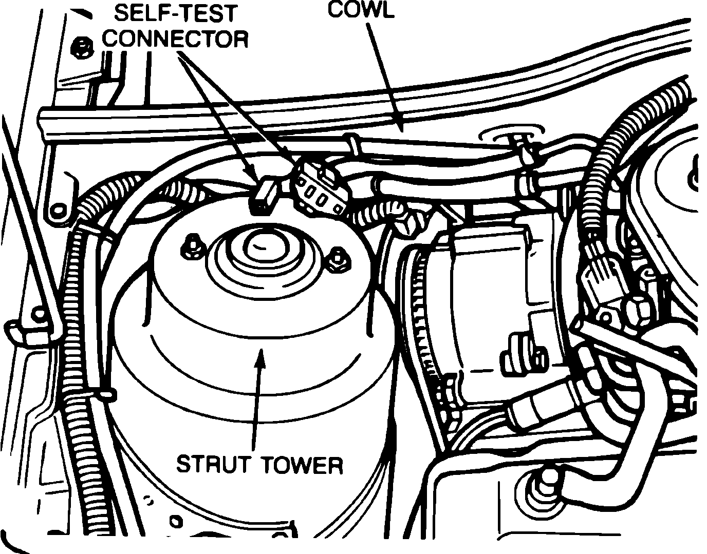 The self-test connector locations are different on front and rear wheel drive models. On front wheel drive models, the self-test connector is located behind the strut tower on the right side on the cowl, Fig. 18. On rear wheel drive models, except Crown Victoria, Grand Marquis, Lincoln Town Car, Continental and Mark VII models, the connector is located below the starter solenoid, between left strut tower and battery, Fig. 19. On Continental and Mark VII models, the connector is underneath the coolant reservoir, on the right side of the engine compartment, Fig. 20. On Crown Victoria, Grand Marquis and Lincoln Town Car models, the connector is located on the left fender apron, near the hood hinge, Fig. 21.