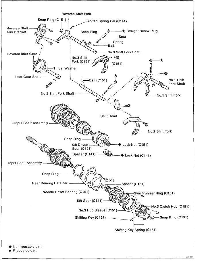 It sounds like it is most likely an internal issue inside the transmission. Something like a worn shift fork or detent ball. I've attached a form from Toyota that shows the likely areas to check. I've also attached an exploded view of the transmissions internal shifting mechanisms.