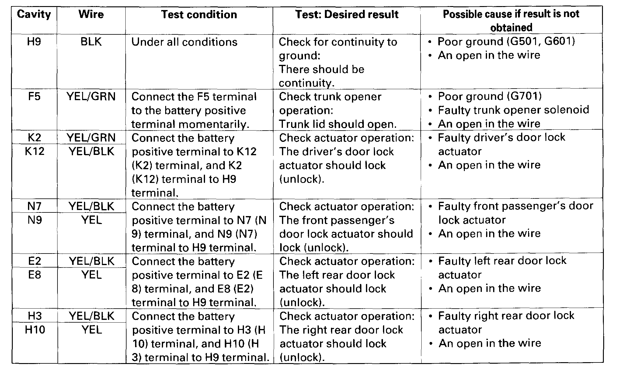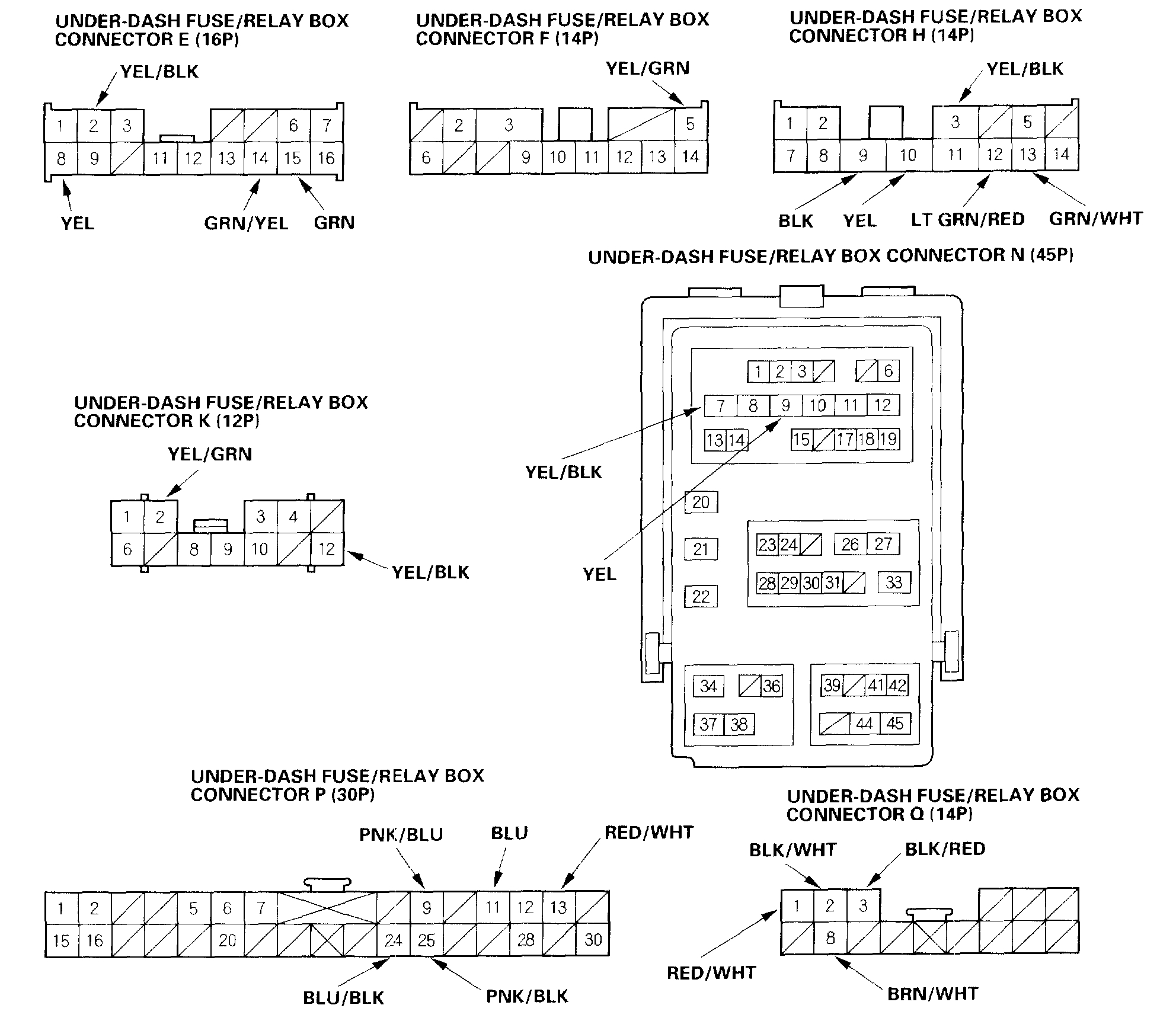 6. Reconnect all connectors to the under-dash fuse/relay box, and make these input tests at the appropriate connectors on the under-dash fuse/relay box.