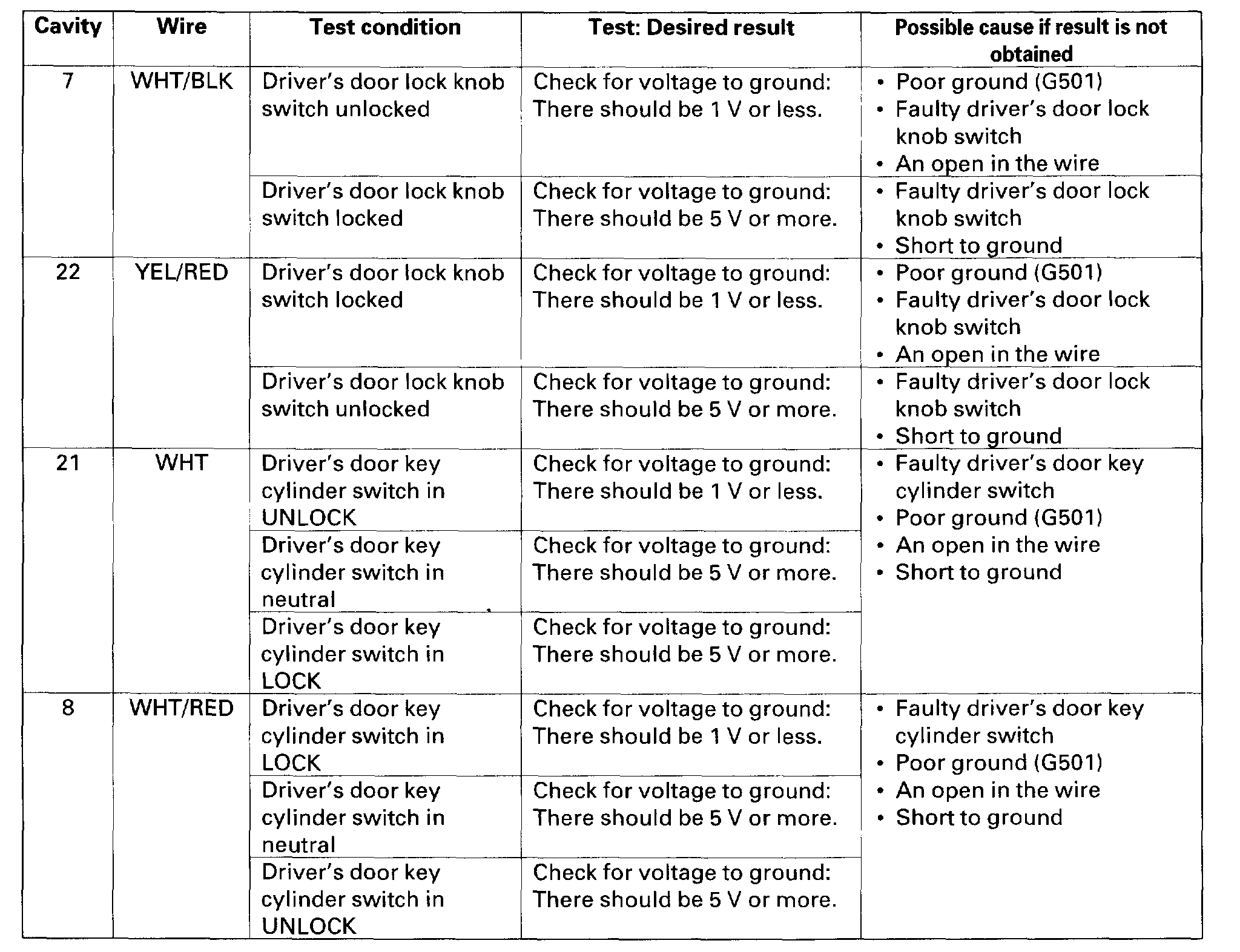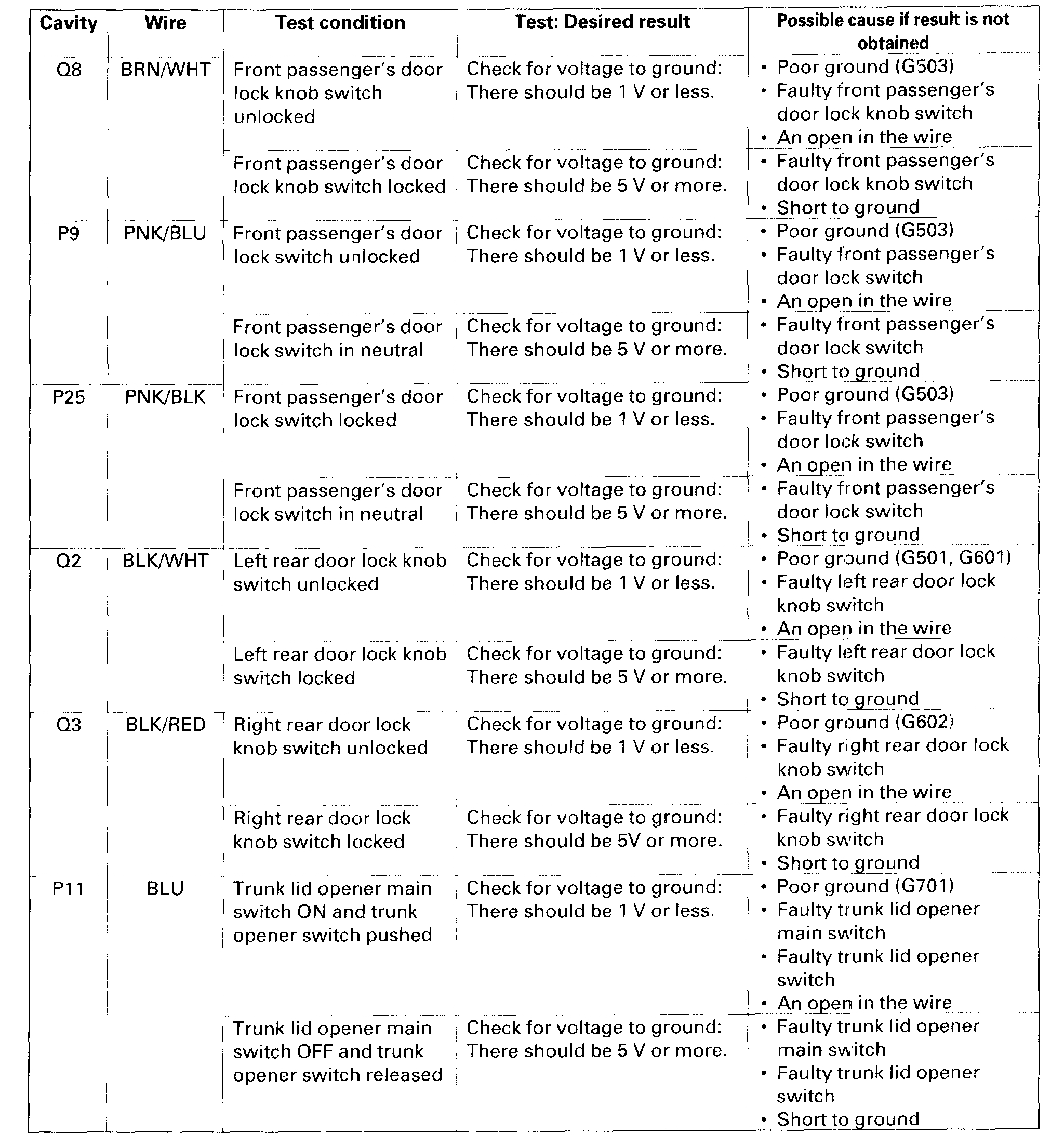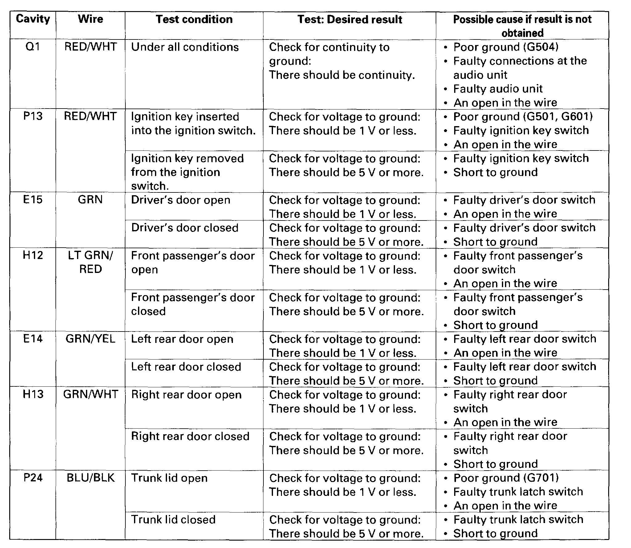 10. Reconnect the connector to the door multiplex control unit, and make these input tests at the connectors.