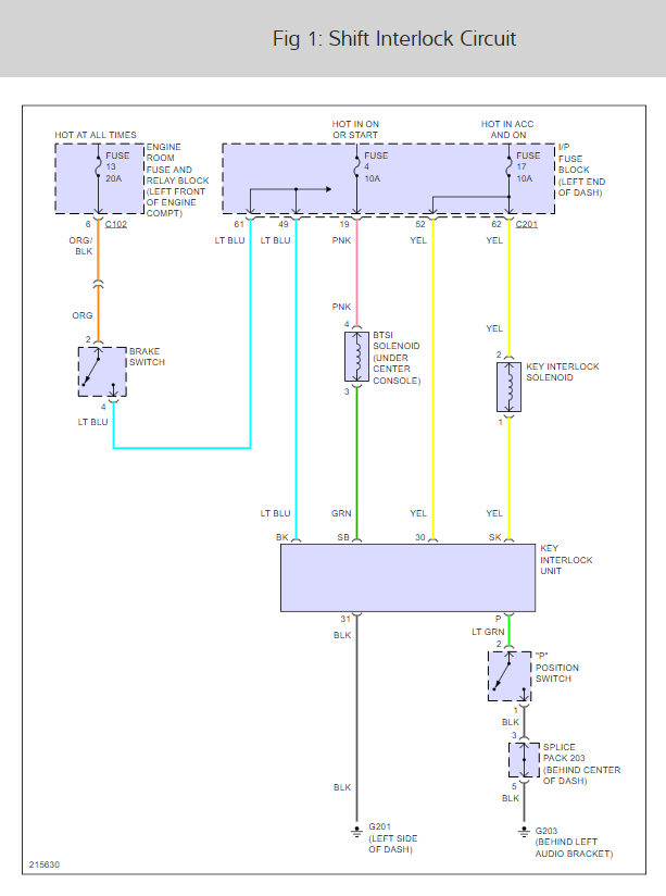 It sounds like the key interlock unit might be bad, but to be sure lets remove the fuses # f4 and #f17 to see if the problem stops. Here are the fuse locations and the shift interlock wiring diagram so you can see how it works.