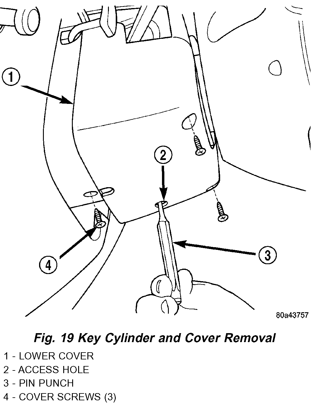 6. Push the pin punch up while pulling key cylinder from steering column.