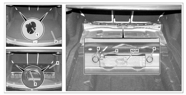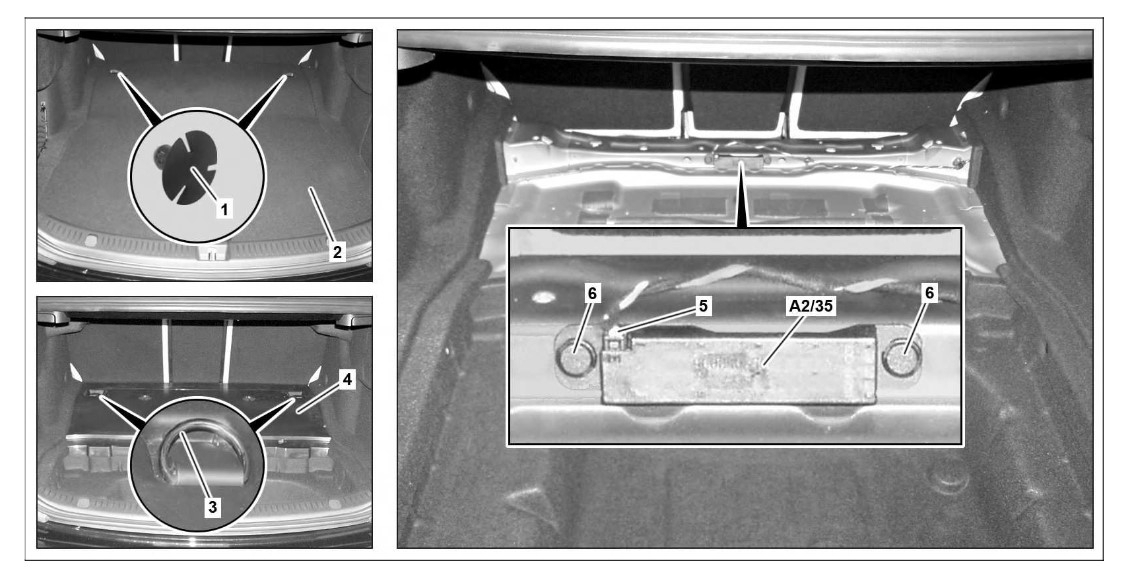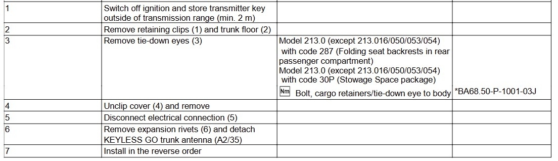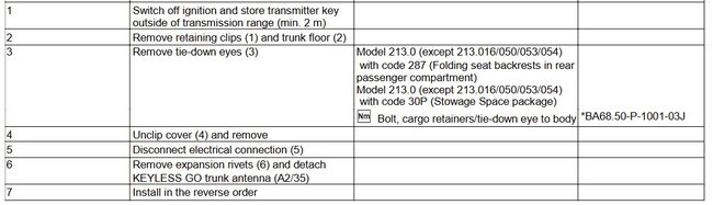 I need to replace the Amplifier for the Keyless Go antenna in the rear of the car. I'm looking for detailed instructions on trim removal and the location of the part in the car.