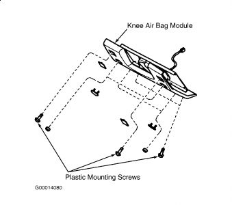 On Sportage models, remove OBD-II Data Link Connector screws attaching it to mounting bracket. Remove 2 upper plastic mounting trim covers by prying from side of covers until they are released from knee bolster panel. Remove 4 middle and lower plastic mounting trim covers by prying from bottom until they are released from knee bolster panel. Remove 4 knee air bag module mounting nuts. Remove 2 upper and lower plastic mounting screws.
