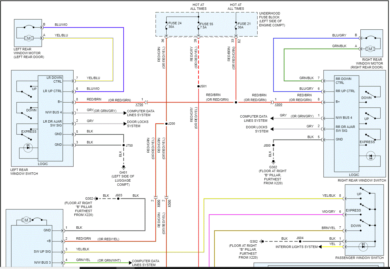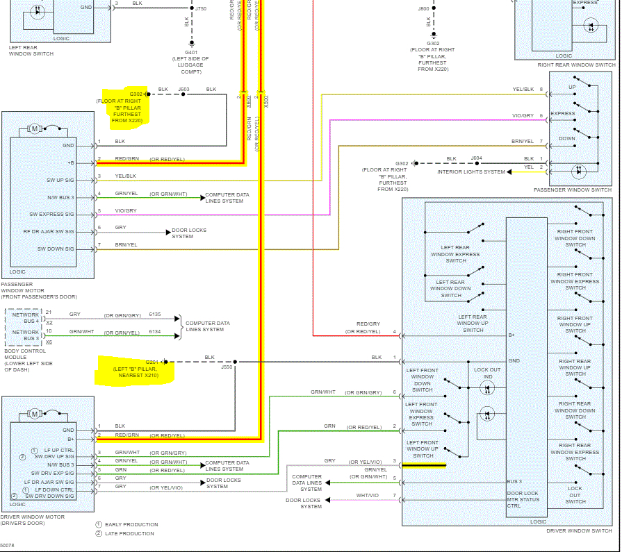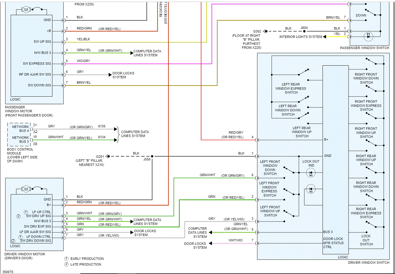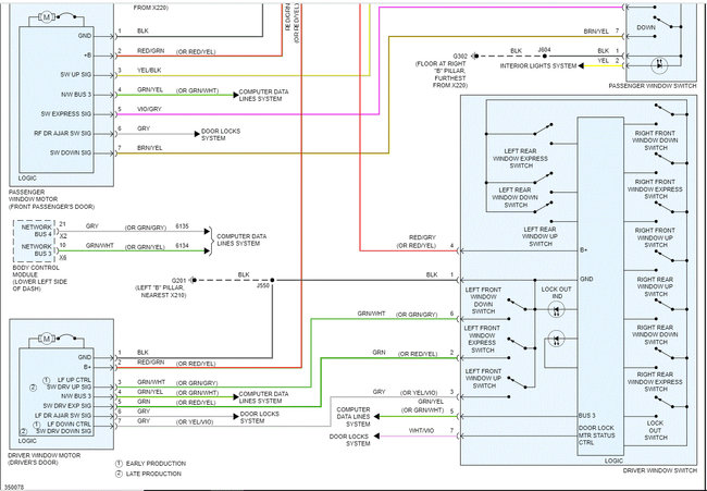 I attached a wiring schematic below of the entire system below that shows the grounding location for both front window motors. If you have power and both stopped at the same time, this is where I would start checking. See pic 1.