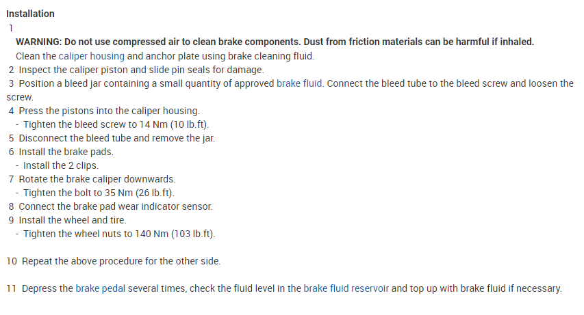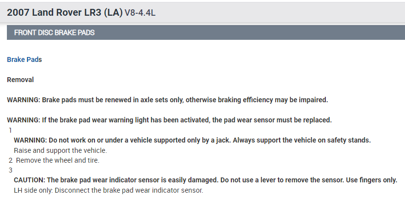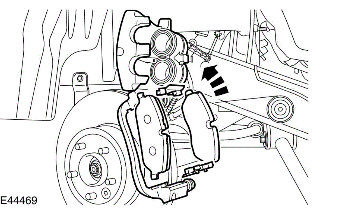 WARNING: If the brake pad wear warning light has been activated, the pad wear sensor must be replaced.
