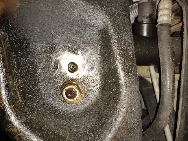 Can you get a picture from a couple different angles? That looks like the oil pan but those plugs look like they have been added to the pan. If this is the oil pan then that would be oil but lets confirm what that first.