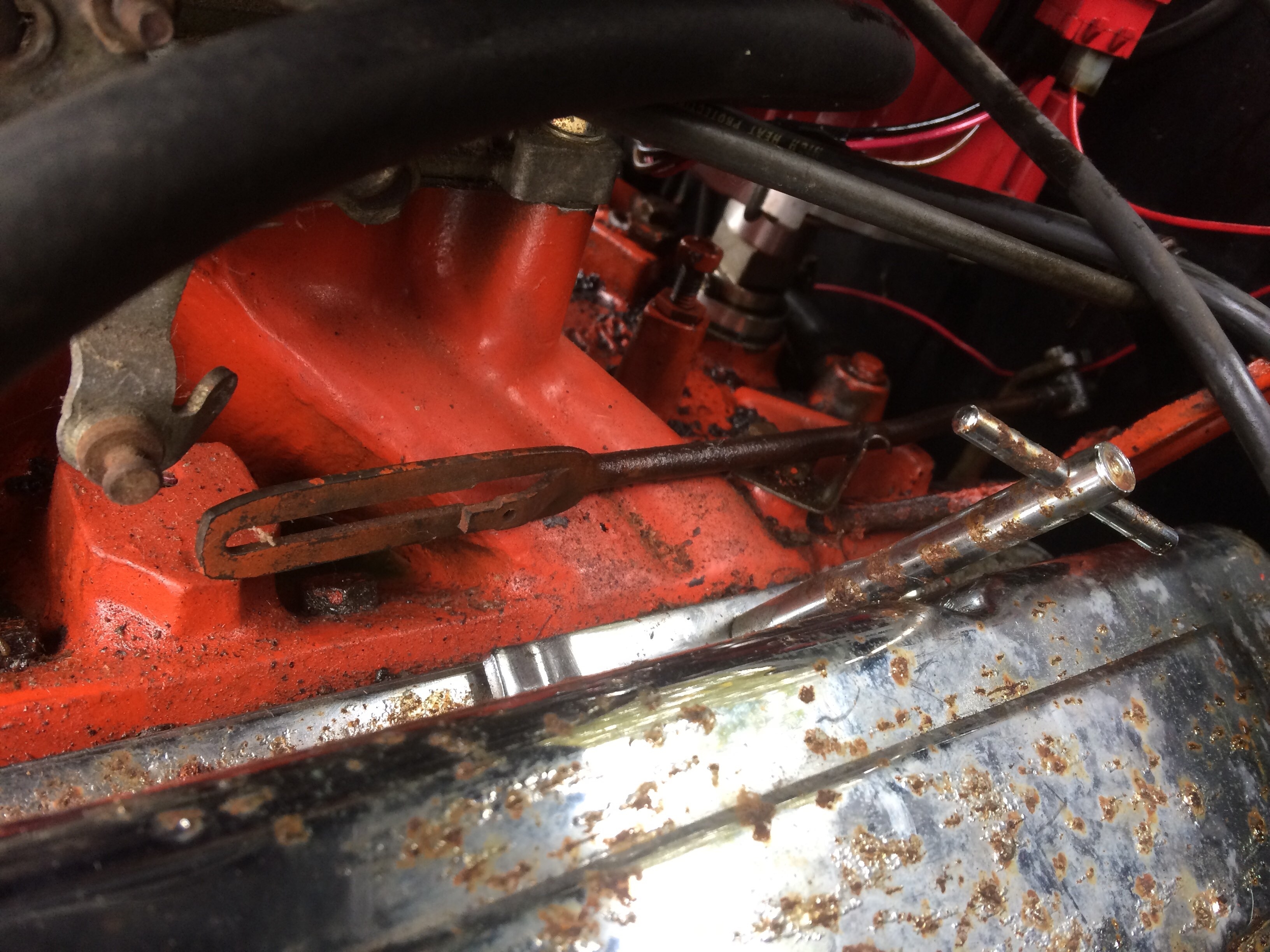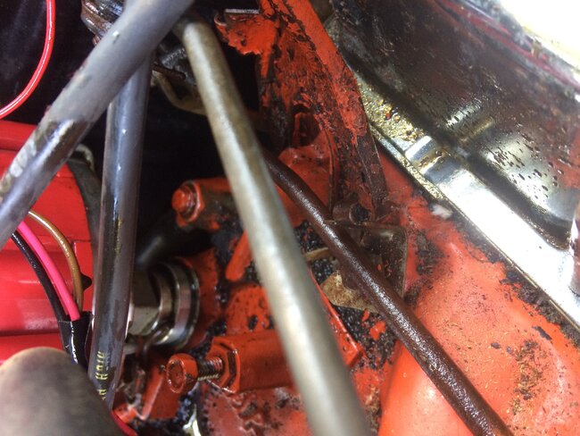 I bought this as a project car to work on and have just gotten it to start. But when the engine is running pressurized oil come shooting out of somewhere under the distributor. We thought it was from the distributor shaft itself but that seems unlikely. The new suspect is a bolt and hose just under. The hose from the diagram we have found should go to the carburetor. But instead, the hose ends three inches from the bolt that we think is leaking oil. We need to figure out if this is actually where the oil is coming from. And how to stop it.