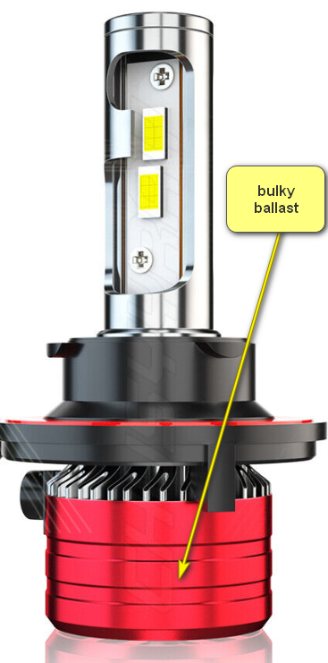 Please note that due to the bulky ballast setup of the LED headlight bulbs the rear headlight cover might no longer fit and then you might get water entry. See image below LED compared to standard bulb