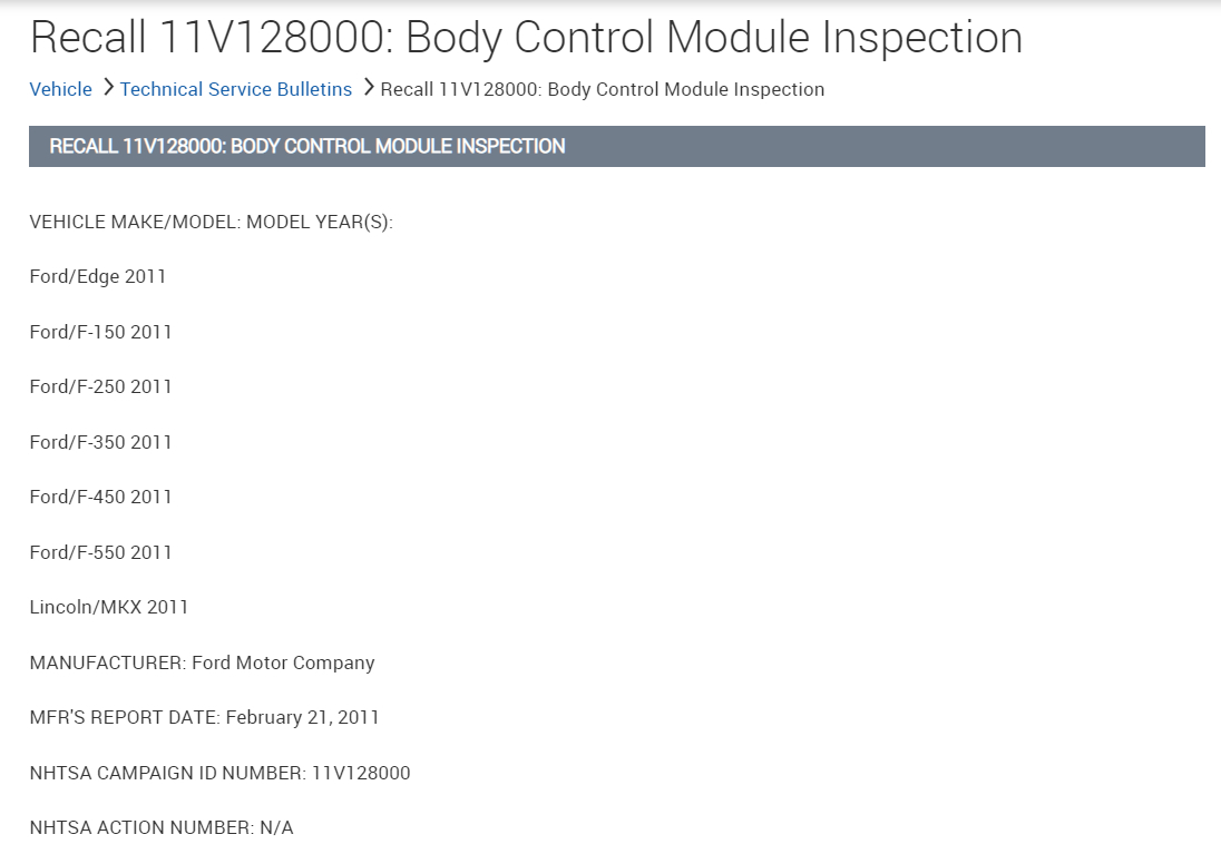 Okay, one other thing, there is a Recall on the Body Control Module for certain build dates of the 2011 f150. There seems to be an issue where the BCM can short out internally and possibly catch fire. So, you might be able to get a free BCM through this Recall, this is something you may want to look into before we even mess around with any of the BCM connectors or circuits. If they see it's been tampered with, they might not replace it. (Diagrams 4 and 5)