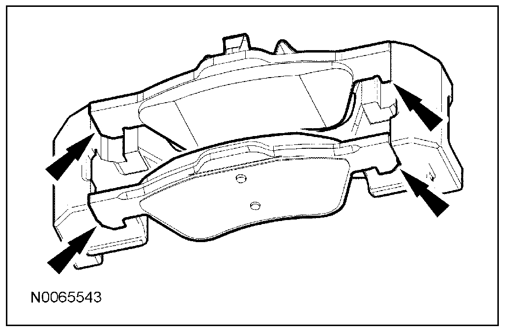 1. Clean, dry and inspect the brake caliper anchor plate. Apply a light coat of specified lubricant to the 4 brake pad contact points on the anchor plate.
