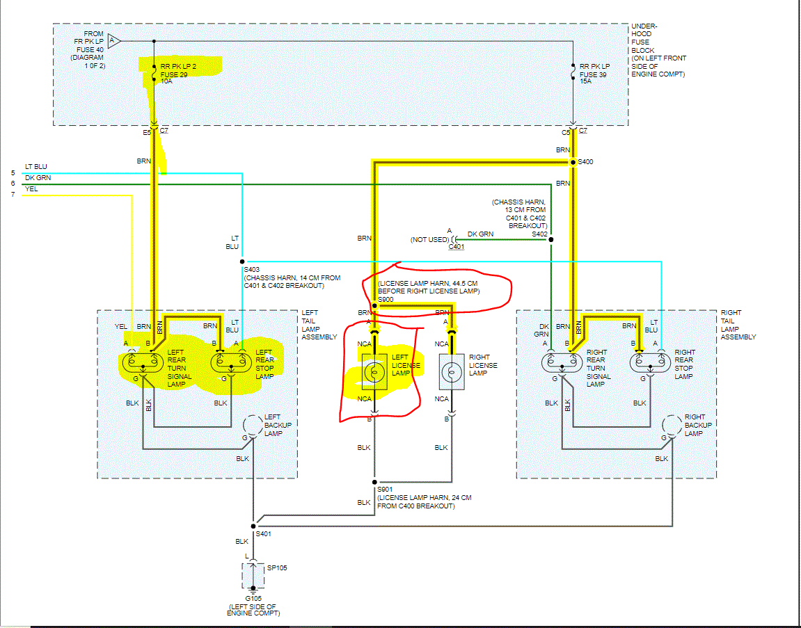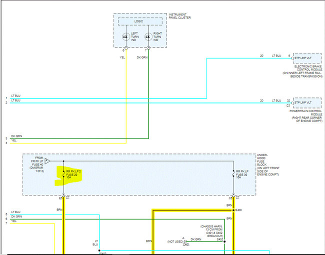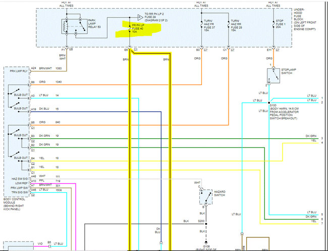 Let me know what you find. Also, the schematics were two pages long. I had to cut them in half to make them readable for you. I did overlap them so you can follow from one to the next. I also highlighted the wiring related to the parking lamps.