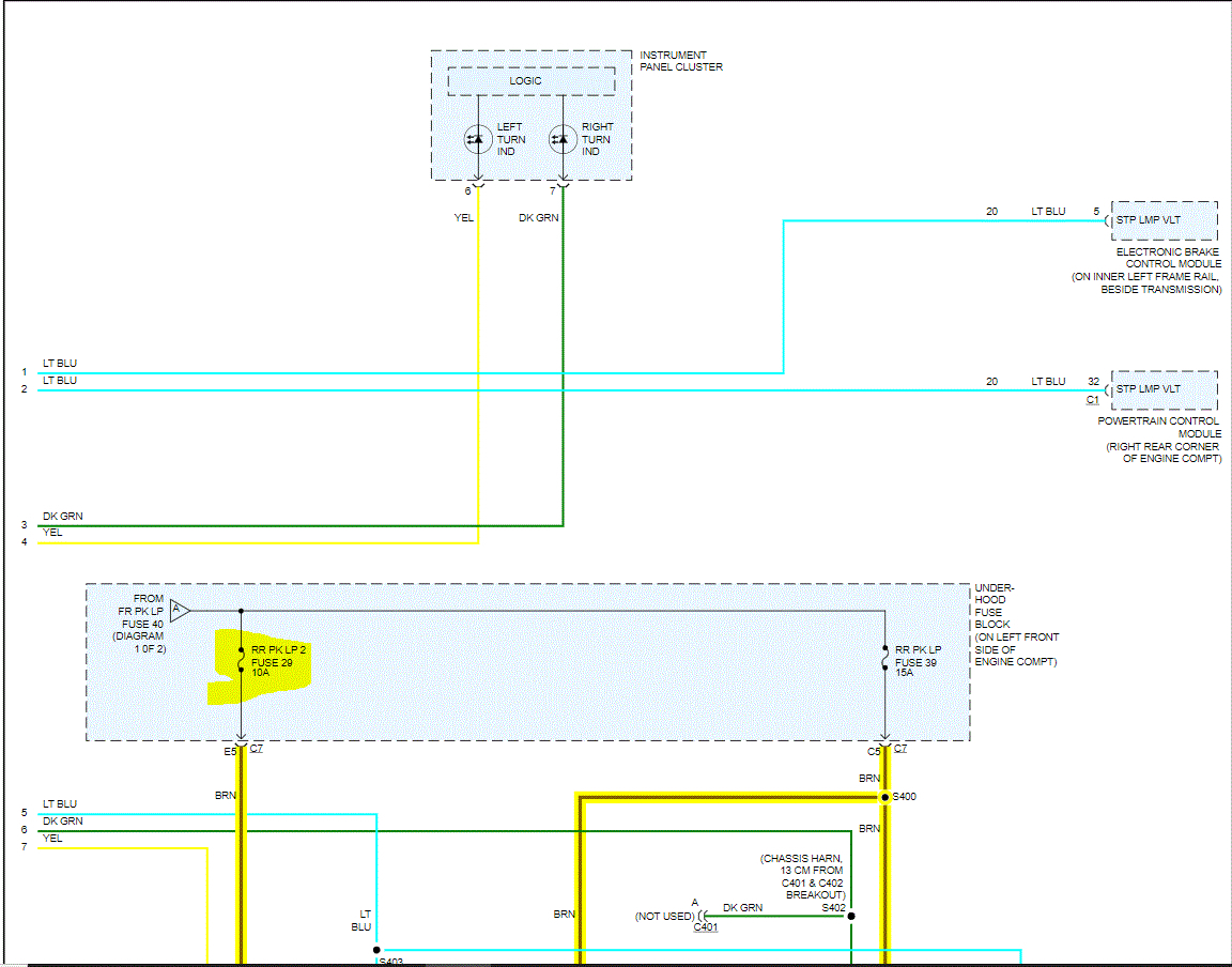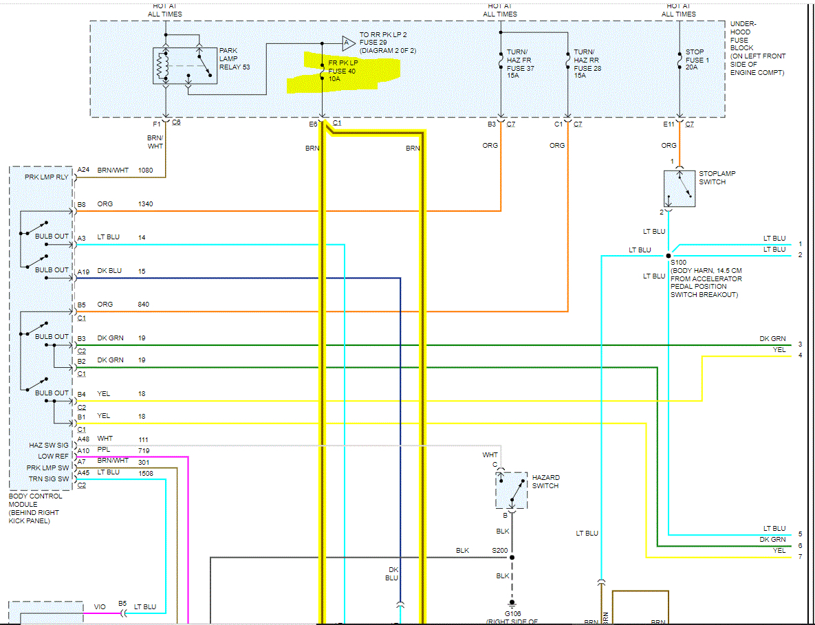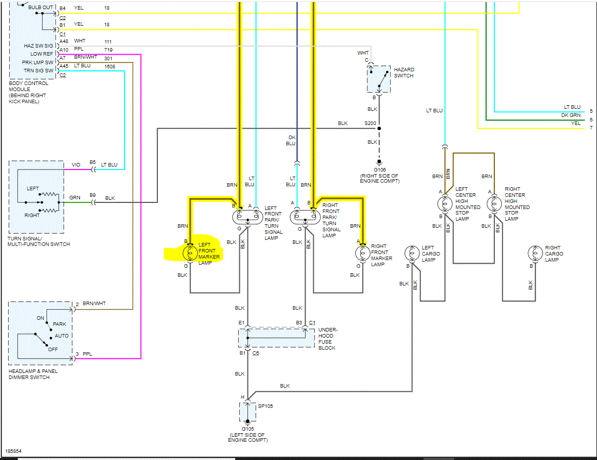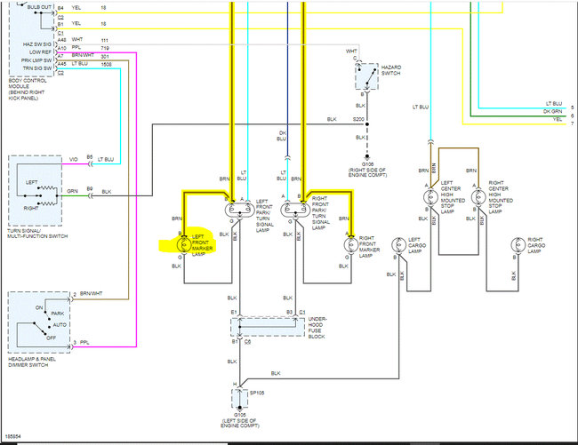 I attached the wiring schematic below for the exterior lighting. What we need to do is this. Start at one of the left side parking lights and locate the brown wire. Check it for power.
