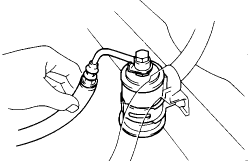 Disconnect the vacuum sensing hose from the fuel pressure regulator, and plug the hose end.
