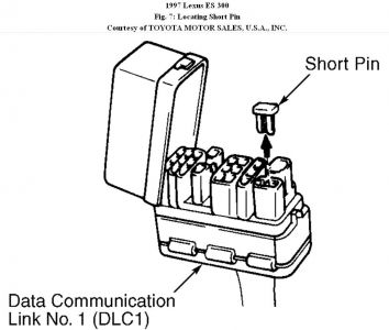 1. Remove short pin from Data Link Connector No. 1 (DLC1). See Fig. 7 . DLC1 is located in engine compartment, right side of intake manifold next to fire wall. Using a fused jumper wire or Service Connector (SST 09843-18020), connect terminals Tc and E1 of Data Link Connector No. 1 (DLC1). See Fig. 8 . Turn ignition on. With vehicle stopped, press brake pedal 8 or more times within 5 seconds. Codes will be cleared.