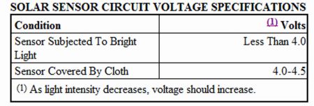 SOLAR SENSOR CIRCUIT VOLTAGE SPECIFICATIONS Condition (1) Volts Sensor Subjected To Bright Light Sensor Covered By Cloth 4.0-4.5 Less Than 4.0