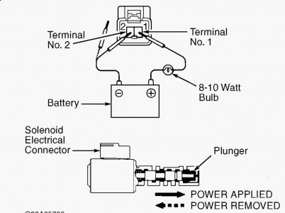 SLN, SLT & SLU SOLENOID Raise and support vehicle. Remove transmission oil pan. Remove appropriate solenoid. See Fig. 1 . To check solenoid operation, connect positive battery voltage to solenoid terminal No. 1. Ensure an 8-10-watt bulb is placed in-line of positive lead. See Fig. 12 . Connect negative lead to terminal No. 2 and monitor valve's movement. Replace as necessary.