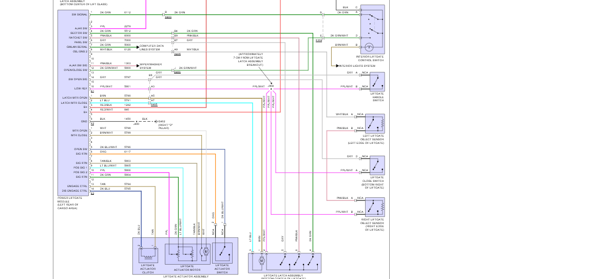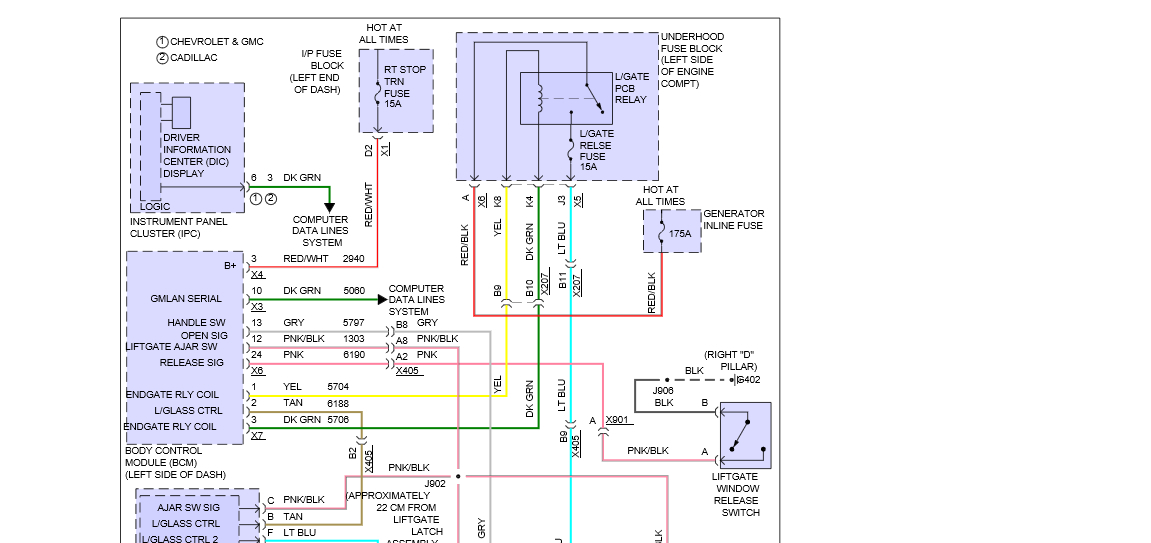 There also is a 175 amp inline fuse that protects the tailgate relay coming from the alternator. The relay for the lift gate is located in a fuse panel under the hood, here is a diagram of that also.
