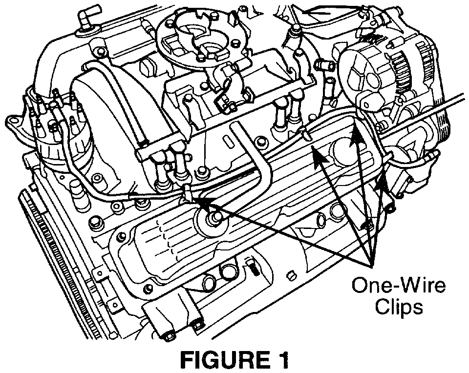 C. Install three (3) one-wire clips p/n 56028186 along the top and front of the valve cover. Use the studs of the valve cover retaining bolts (Figure 1).