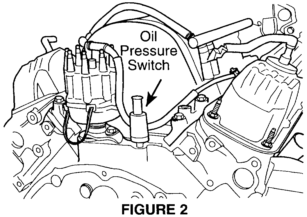 H. Route the distributor end of the coil wire down and behind the intake manifold, in front of the oil pressure switch (Figure 2).