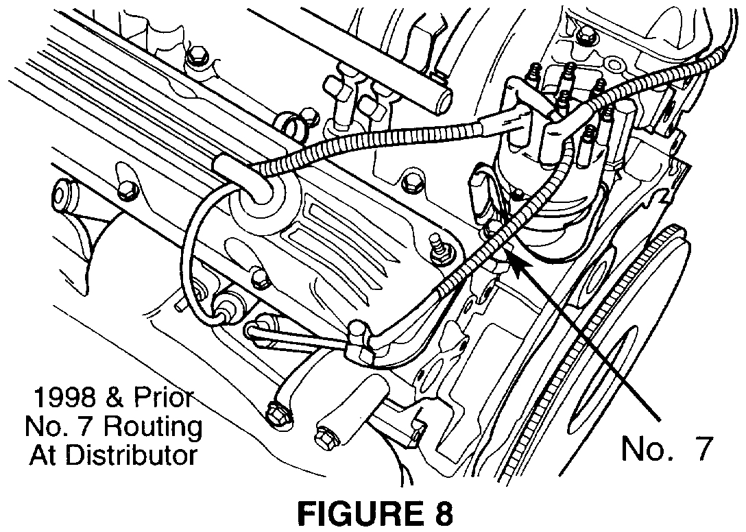 A. Verify that the No.7 cylinder plug wire crosses over the distributor cap and leaves the distributor cap between the No.3 and the No.6 tower terminals (Figure 8). This is the original wire routing for 1998 and prior model years.