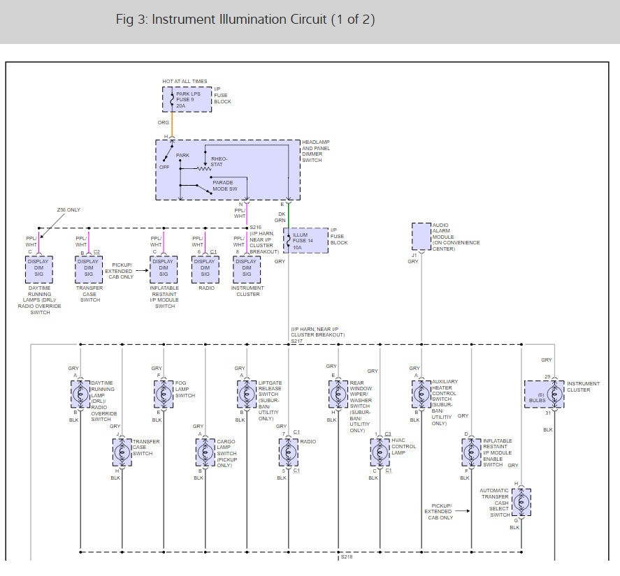 The voltage missing on fuse 14 comes through the dimmer portion of the switch assembly. (Be sure the switch is turned on when you're checking for that voltage on fuse 14). Since that is missing, you will find it's also missing on the brown wire at the switch connector. That's the wire that feeds the tail lights. We know both the tail light and dash light circuits aren't going to develop their own problems at the same time. Instead, your old switch is defective and the new one is the wrong part, or there's a break somewhere in what they have in common. That is the orange wire at the switch.