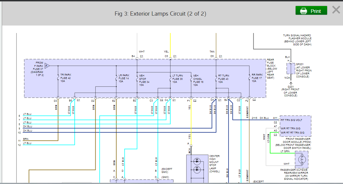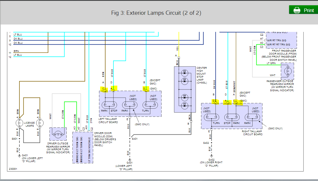 In the diagrams down below I have provided you with the wiring diagrams for the taillight circuits. I have highlighted six wire that you will need to measure the voltage at With the headlamp switch in the on position. Red lead goes to the wire and the black lead goes to a known good ground location. Measure each wire and record your answer. Please get back to us with what you are able to find out on each reading please. We can go from there.