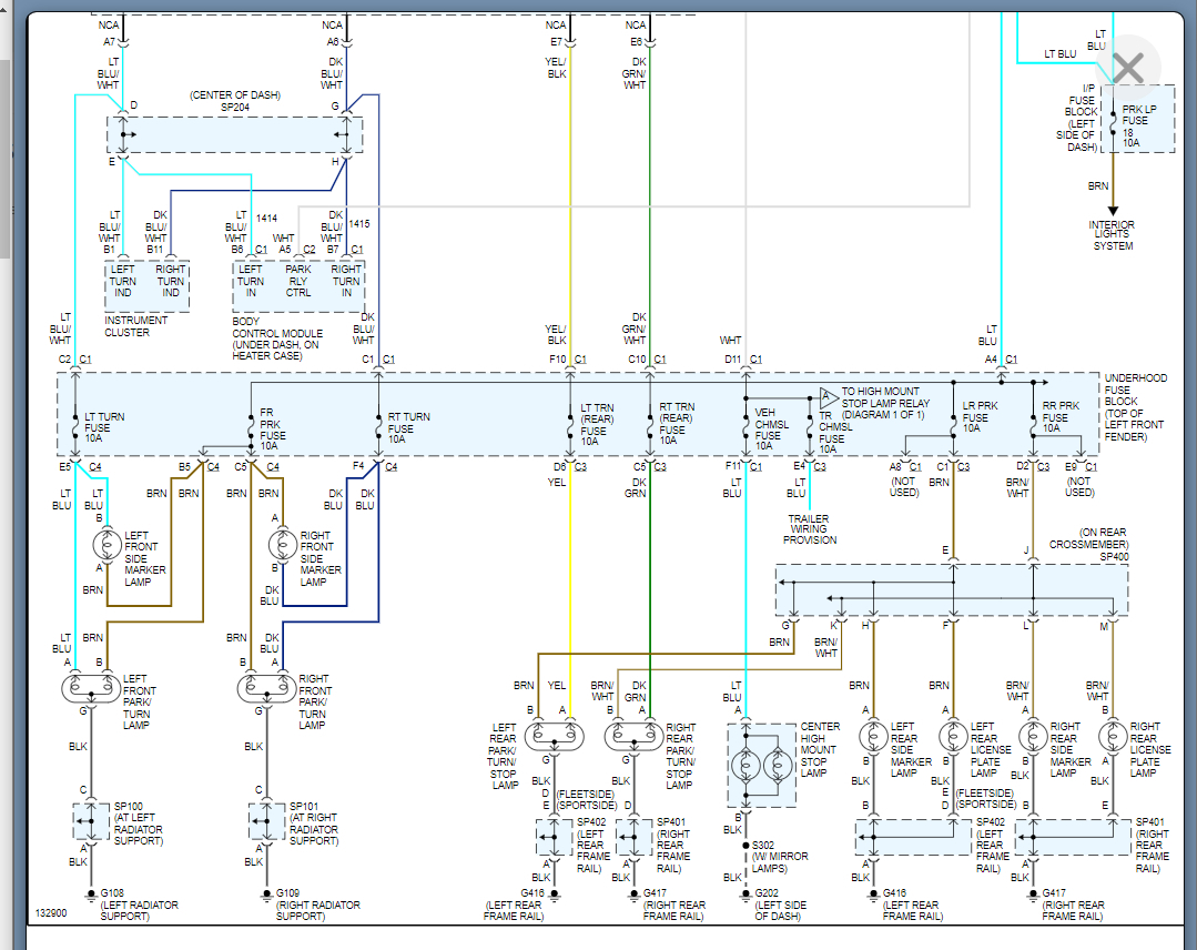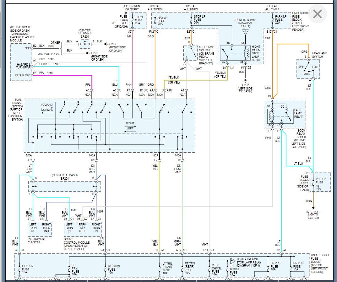Please find the wiring diagram below on how this works. However, basically when you press the brakes the switch closes and sends voltage through the turn signal switch to the two lower brake lights. It then sends voltage through the under hood fuse block where it energizes the high mount relay and turns the high mount light on.
