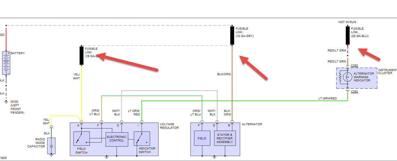 Also, when the system is charging, there will be around 5 - 7 volts on the white / black wire. That voltage is tapped off the output and is what tells the voltage regulator to raise the voltage on the green / red wire to turn off the warning light.