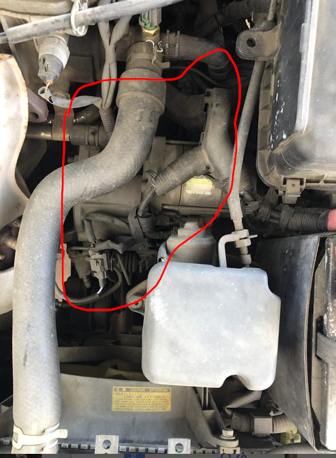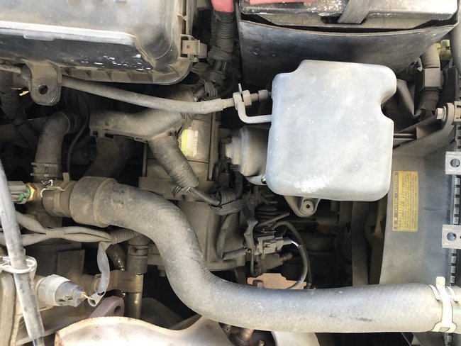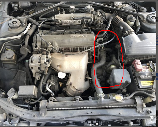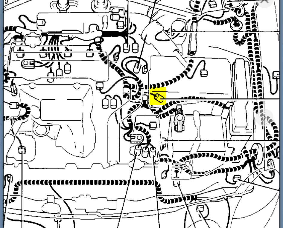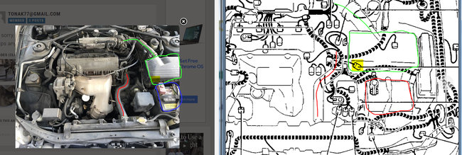 The last picture is a side by side of your picture and the diagram. I tried to trace and outline the same areas on your vehicle to the diagram. Like the battery is circled in blue on your picture but for some reason switched to red in the diagram. The air cleaner and intake tube is green on both. I traced the upper radiator hose in red and then finally highlighted the area of the sensor in yellow. Looks like it will be just under the lower left corner of the air box attached to the transmission.