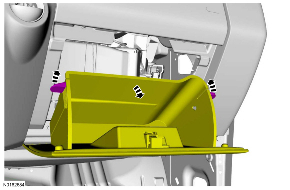 While pushing the glove compartment door tabs, position the glove compartment downward.