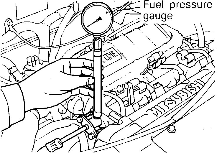 9. Stop the engine and check for a change in fuel pressure readings. Pressure should hold for 5 minutes. If the gauge reading drops, observe the rate of drop. Determine the cause according to the following symptoms.