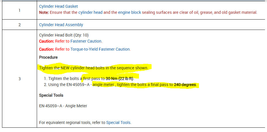 Next, you have to do this in two steps. Once you have all the bolts installed, using the sequence provided, tighten the head bolts to 22 ft/lbs. Once that is done, you need to turn each bolt an additional 240° further.