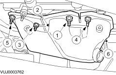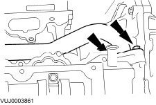 1. NOTE: Apply a 5 mm diameter bead of silicone gasket sealant WSE-M4G323-A6 or equivalent meeting Jaguar specification on the half round gaskets and apply an 8 mm diameter bead of silicone gasket sealant on the two places where the cylinder head and front timing cover join.