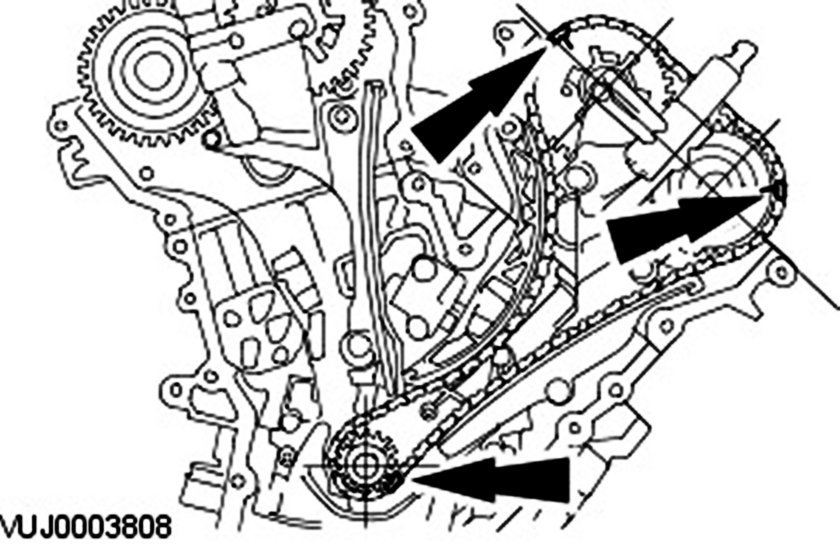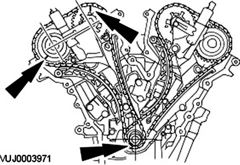 Make sure the left-hand timing chain alignment marks have remained correctly positioned to the camshaft sprocket and crankshaft sprocket alignment marks.