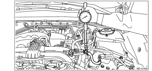 2. Connect the fuel pressure gauge with ST1 and ST2.