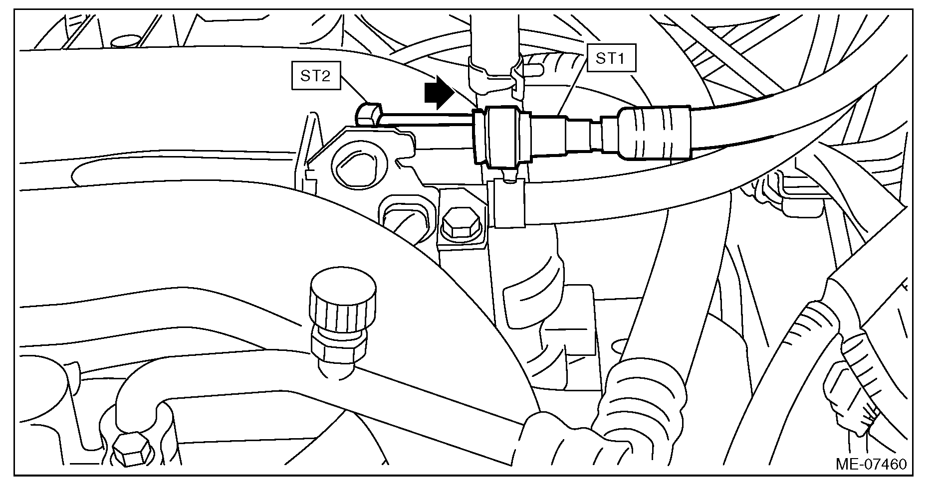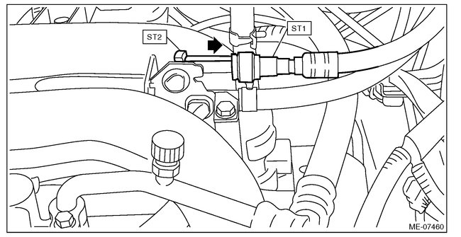 - When disconnecting the ST1, install the ST2 to the fuel pipe assembly, and press the ST2 in the direction of arrow to disconnect the quick connector on the ST1.