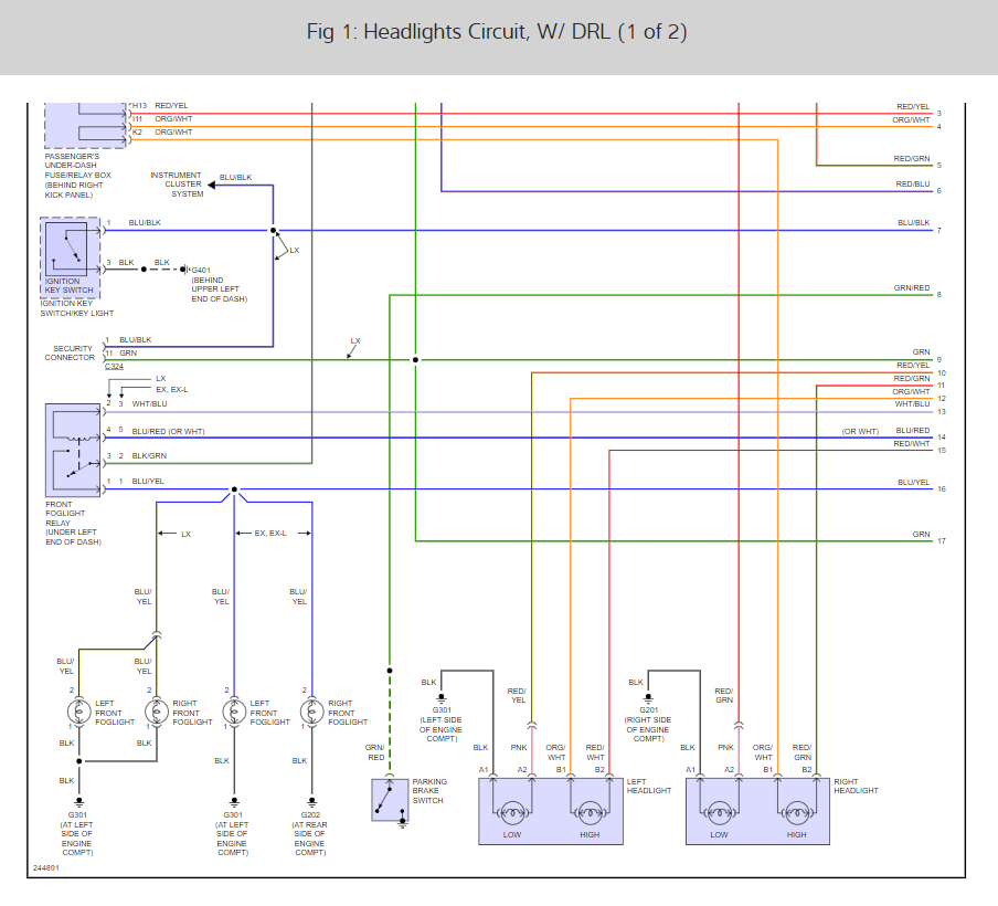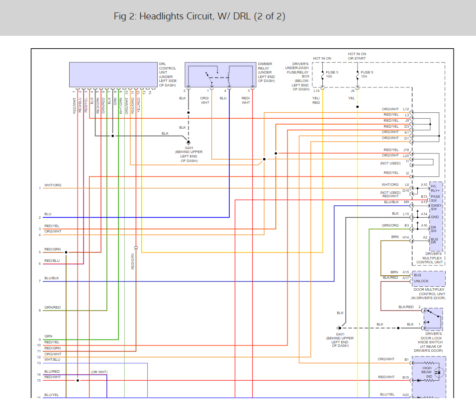There are three fuse # 44, 43 and 45 that need to be checked with two headlight relays as well. Here are two guides to help get us started on fixing the problem and the headlight wiring diagrams and fuse and relay locations in the diagrams below: