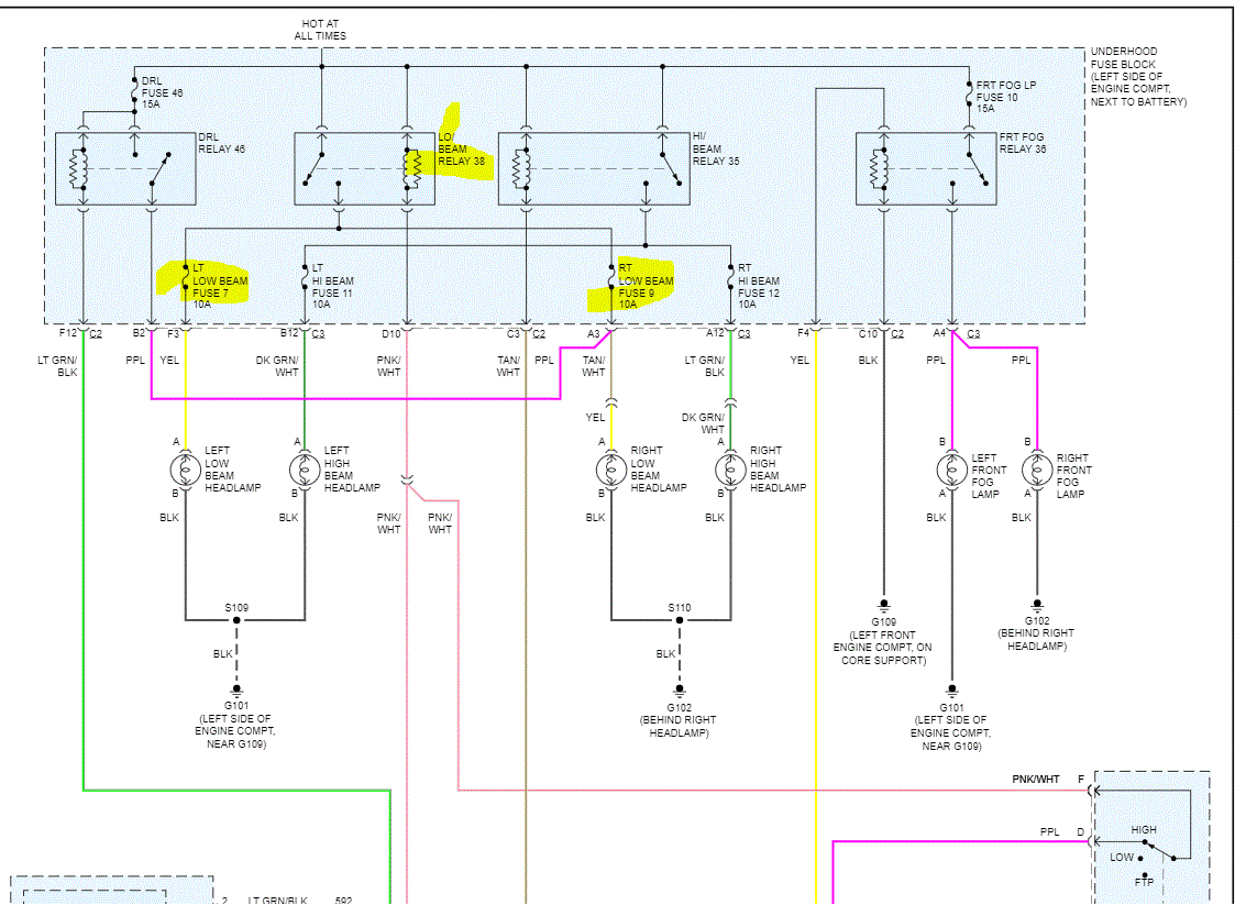 First, the two pics below are the entire wiring schematic for the headlamp system. I did highlight the low beam relay and fuses. You indicated the fuses are good and the relay. Is there power to the fuses and relays?