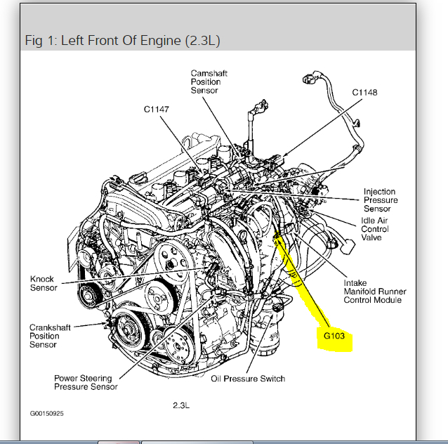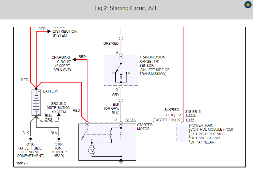In the diagrams down below I have included a wiring diagram of your vehicle's starting circuit for reference. We are going to be working our way from the battery to the starter. so let's start with the battery. Can you take a voltage reading across the terminals of your battery and inspect Grounds #103 and #104. I have also included instructions for inspecting grounds in the diagrams down below as well. Ground 103 is on the left hand side of the engine compartment and I have included a diagram for you for it, and Ground #104 is on the cylinder head. Please go through these guides and get back to us with what you find out. We will continue on from there.