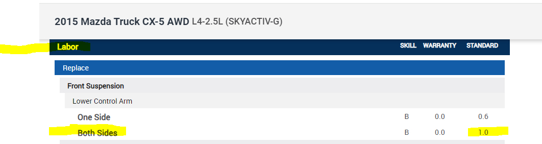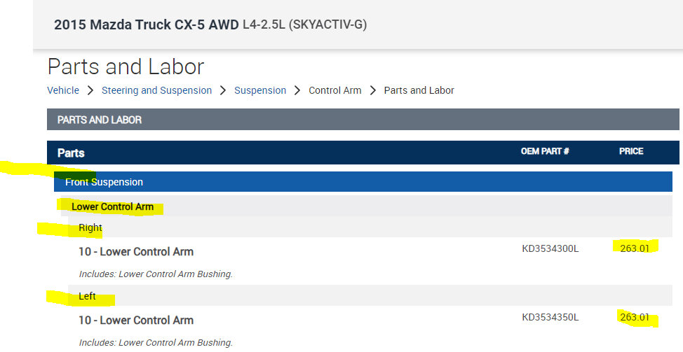 If you look at pics 1 and 2 below, they show the cost of the OEM new lower control arms which is expensive. Additionally, to install both only calls for one hour labor, so you would need to ask the dealer their labor cost.