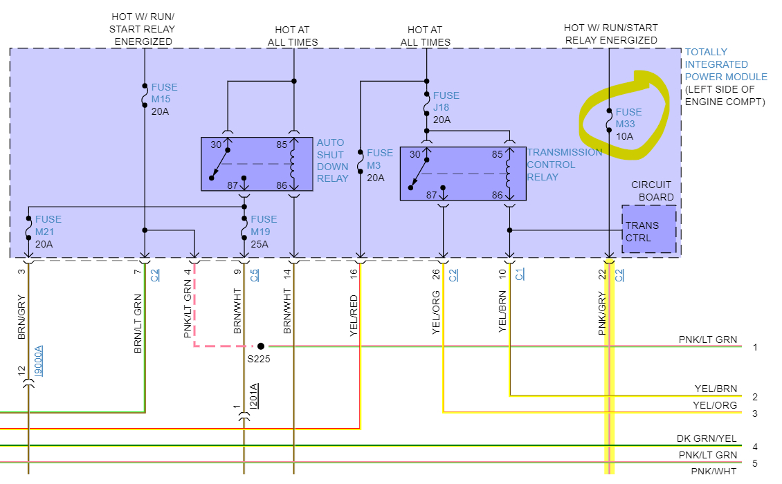 Hi, I am looking for a wire connected to TIPM fuse M33 (10 A). Please explain in which connector 1-7 the wire sits and what is the exact color of it for a precise location. That would be much appreciated. Regards, Ralphi