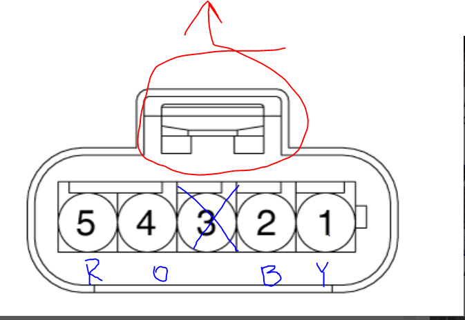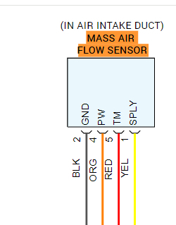 The connector that plugs into the MAF was broken during a battery change. I bought a new connector, which is supplied with 8 inches of wires to splice into the harness. My problem is that the new connector has all black wires, while the wiring harness has different colored wires (red, orange, black and yellow). I'm looking for a wiring diagram in order to make the correct wire connections?