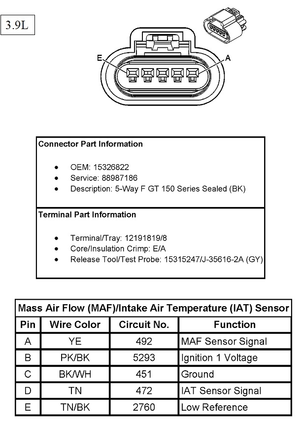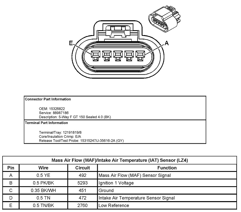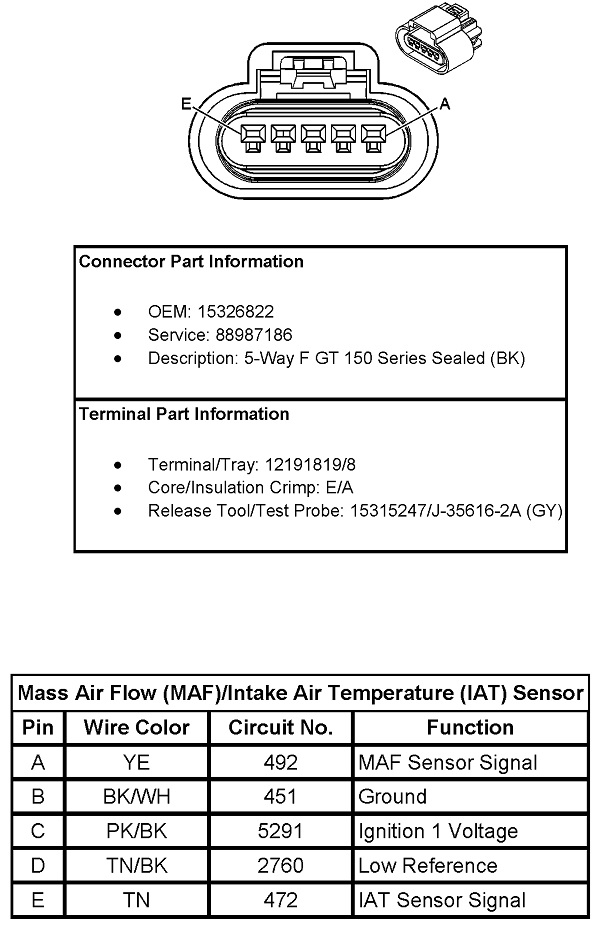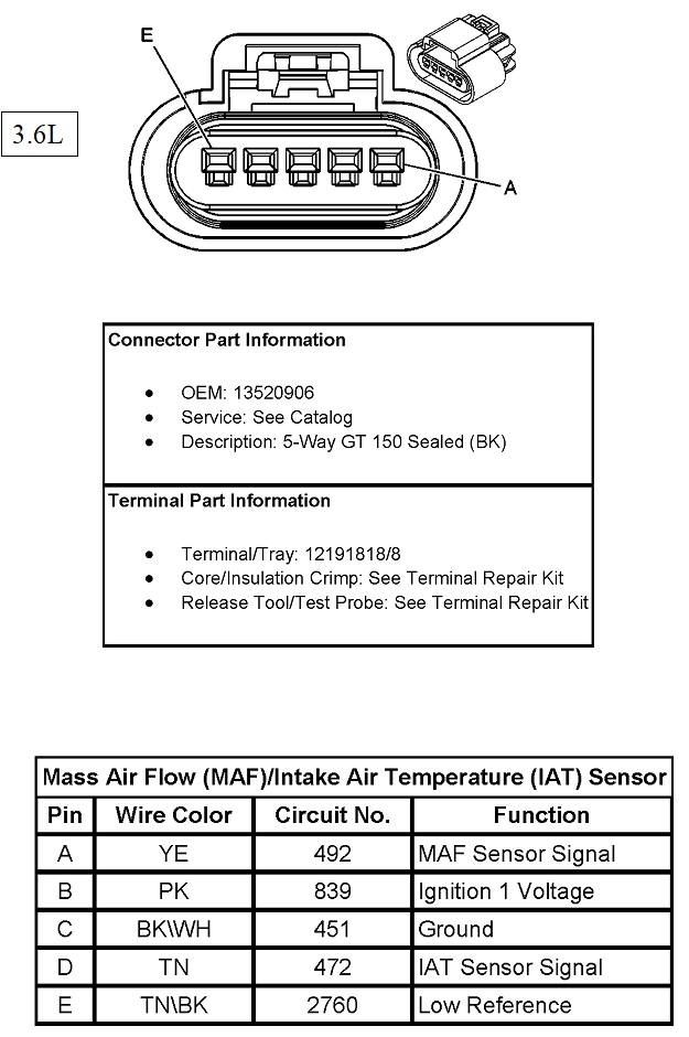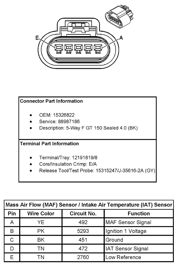 This one does show three of the colors you listed, but those are powers and grounds which can be common to other sensors. Double-check you're on the right sensor, although there aren't any others I can think of that have five wires. You actually have two sensors in this assembly. It sits in the fresh air intake tube ahead of the throttle body.