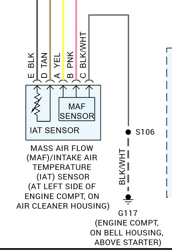 Squirrels ate the wiring to my MAF sensor. A shop replaced them with all white wires but spliced to the original colors. Another squirrel ate them again. Because of the white wires I don't know the mapping. When I get back to the original wire colors I need to figure out which colors go to where on the new pigtail. What is the color map for the 5 wires on the pigtail? Thanks