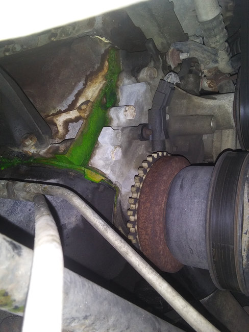 Based only upon what is visible in the photo and any past experience, I wanted to ask which gasket likely has failed allowing the loss of coolant? Water pump, timing chain cover, or head gasket?
