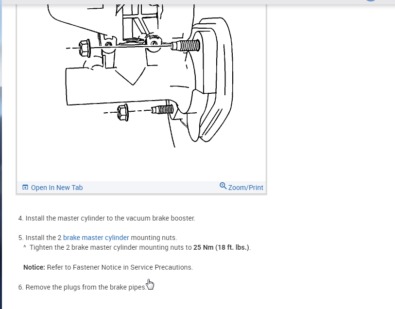Tighten the 2 brake master cylinder mounting nuts to 25 Nm (18 ft. lbs.).